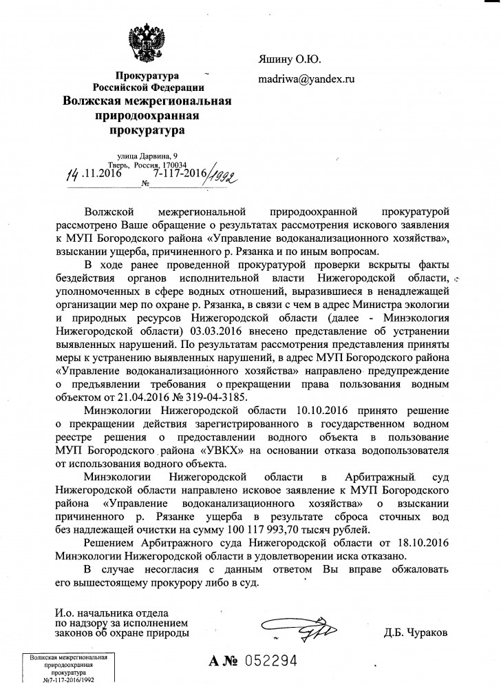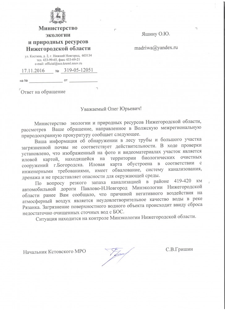 Добрый вечер всем ! Хорошая новость и менее хорошая, но главное согласно этого ответа в р. Рязанка должны быть прекращены сбросы сточных вод МУП Богородского района " УВКХ ", забрали у них нашу бедную речку. Ура !!!