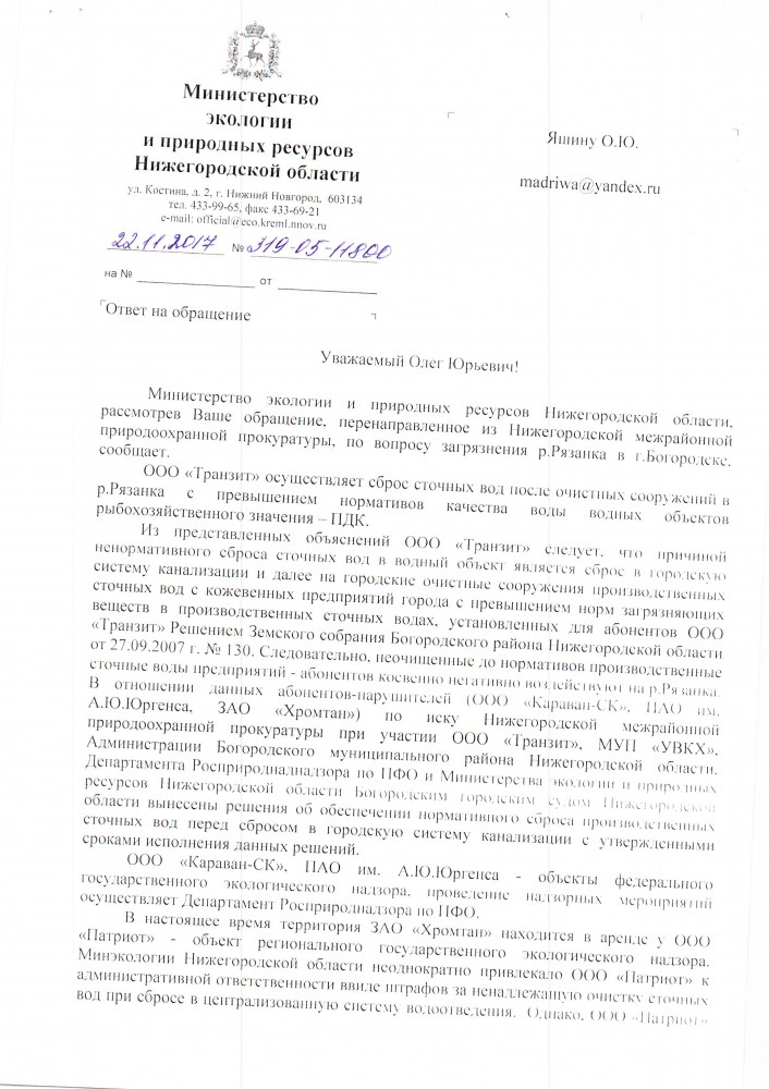 | Наблюдения - сегодня вонища в районе улицы Данилова и перед железнодорожным переездом в районе 22 часов. А так же очередное письмо от Министерства экологии, но теперь новенькое!. Специально уполномоченным органом по вопросу загрязнения атмосферного воздуха является Управление Роспотребнадзора по Нижегородской области. Оно же и осуществляет контроль соблюдения обязательных гигиенических требований и соответствия санитарному законодательству.Подписал начальник Центрального межрайонного отдела государственного экологического надзора и окружающей среды М.Г.Крылов. Только я не понимаю, в предыдущих письмах само Министерство экологии заверяло нас, что проводило проверки и никакого запаха не выявляло. Теперь им надоело нам что-то отвечать, нашли другую отписку. Надоело!!!!!!!!!!