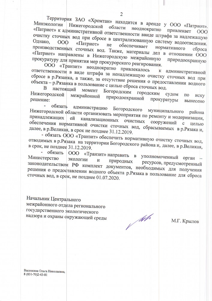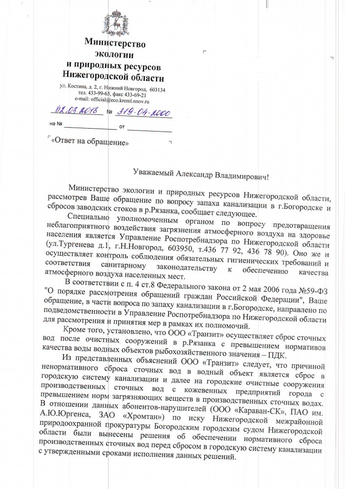 Я, Яшин Олег Юрьевич, город Богородск Нижегородская область. Согласно ответа Управления Федеральной службы по надзору в сфере защиты прав потребителей и благополучия человека по Нижегородской области от 14.02.2018 номер 04-245/3-2581 прошу Вас принять меры для возбуждения уголовного дела к ООО Транзит из-за грубого и неоднократного нарушения санитарного законодательства РФ ( п.4.1, п.4.1.1 ( абз.1, 3) , п.5.2, приложение 1 ( п.п.14, 15, 16 ) СанПиН 2.1.5.980-00 Гигиенические требованиия к охране поверхостных вод ). А вот я получил ответ, смотрите новое в конце ответа. Буду следить за этим делом, это помимо нецелевого использования выделеных денежных средств на капитальный ремонт Богородских городских очистных сооружений. Если будет отказ или молчание направим обращение в прокуратуру ! Прикрепленный файл (Scan20180329122322.pdf, 490.71 Kb, просмотрен: 246 раз) ----------