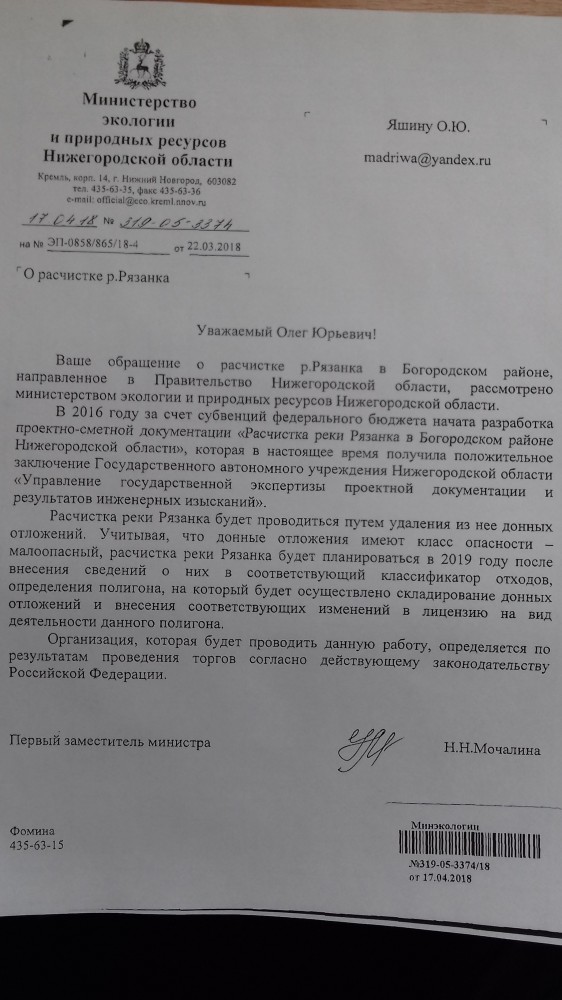 Прошу Вас срочно провести прокурорскую проверку ( ответ в приложенном файле ). А именно, согласно ответа Министерство экологии и природных ресурсов Нижегородской области донные отложения р. Рязанка имеют класс опасности- малоопасный. Считаю, что класс опасности установлен необоснованно. Так как основные источники загрязнения р. Рязанка являются кожевенные заводы города Богородска. ----------