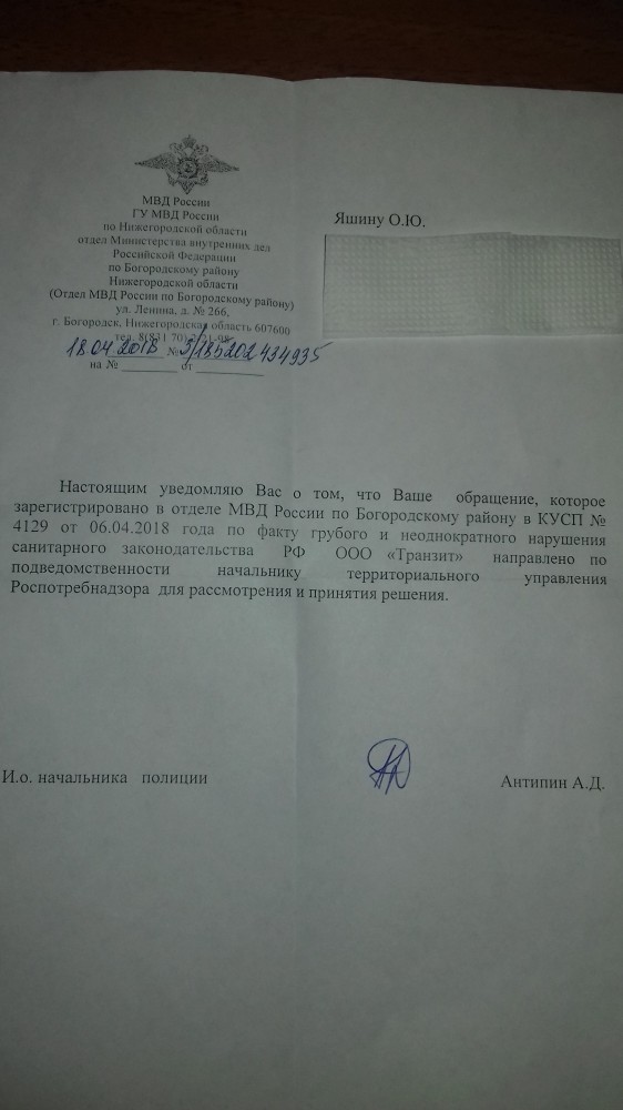 Добрый вечер всем. Жители города Богородска и района сегодня давал объяснение сотруднику полиции на счёт моего обращения о возбуждении уголовного дела о нарушении требований санитарного законодательства РФ., к руководителю ООО Транзит.