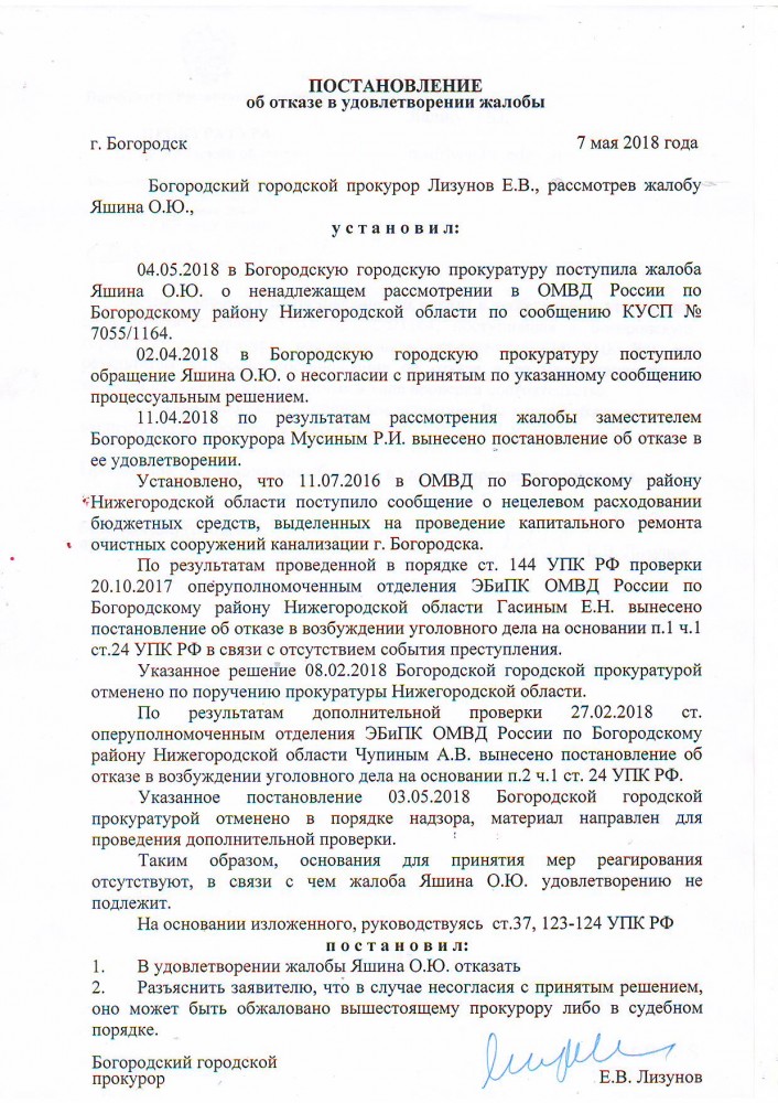 Добрый вечер всем ! Направил опять обращение в прокуратуру Нижегородской области: Я, Яшин Олег Юрьевич, город Богородск Нижегородская область. Прошу Вас изучить материалы дела и принять меры для возбуждения уголовного дела о нецелевом использование выделеных денежных средств на капитальный ремонт Богородских городских очистных сооружений. ОЭБ и ПК ОМВД России по Богородскому району Нижегородской области и Богородская городская прокуратура отказываются возбуждать уголовное дело и тянут время специально. Это факт сговора данных государственных органов власти в городе Богородске Нижегородской области.