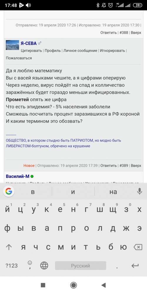 | Василий-М написал: а в целом по стране скорость роста обогнала уже Европу. пруфы есть? вы с прометем меня конспектировали, я цифры выдавал две недели назад с оглядкой на Италию, Испанию мой прогноз запоздал на два - три дня а если, опять же, глядя на математику и зная, что в Италии проживает 60мил человек, а у нас 150мил мы запаздываем раза в два, по скорости распространенитя ----------