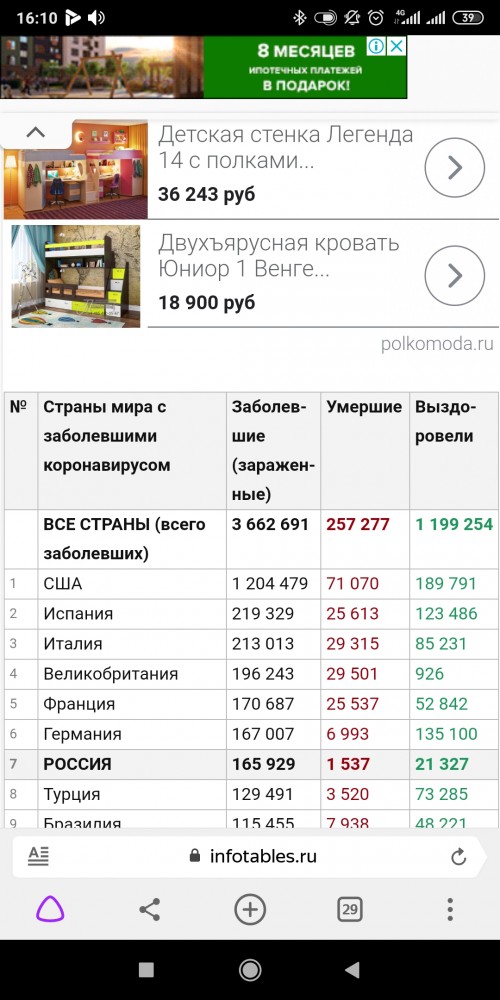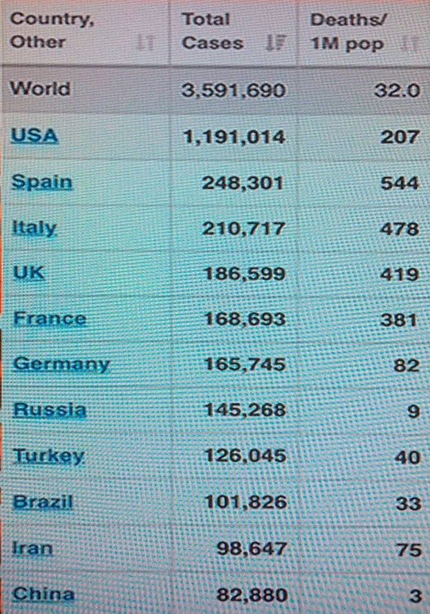 | На прошедший понедельник были вот такие данные по вирусу. Как их прилепить к уровню здравоохранения, возможностям мобилизации и т.п., каждый придумывает сам, в зависимости от того, что желает увидеть. У нас говорят: смотрите, насколько в США мощнее медицина, там выявили впятеро больше больных, чем в отсталой России, а смертность на миллион заболевших ниже, чем впятеро. Вот табличка