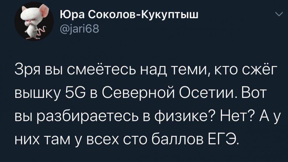 | Я смеюсь на теми кто сжег вышку в Северной Осетии потому, что там нет и не могло быть вышек 5G. Потому что в России нет 5G и не предвидится. Это и есть самое смешное, а не результаты их школьных тестов.