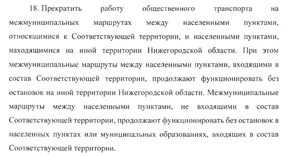 Горожанин написал: Ещё интересен п.18 Указа: общественный транспорт из Богородска в район теперь запрещается... Все деревенские автобусы отменяются Да, пожалуй это один из самых сильных запретов. Вот ссылка на указ губернатора. Я так понимаю, под запретом и остановки муниципального транспорта между Богородском и Нижним Новгородом. Теперь маршрутки и газельки будут ходить в Нижний и обратно без остановок. Также получается, что кроме как из Дзержинска, Богородска, Бора, Кстовского, Лысковского района и Выксы в Нижний Новгород муниципальным транспортом въехать и выехать нельзя? ----------