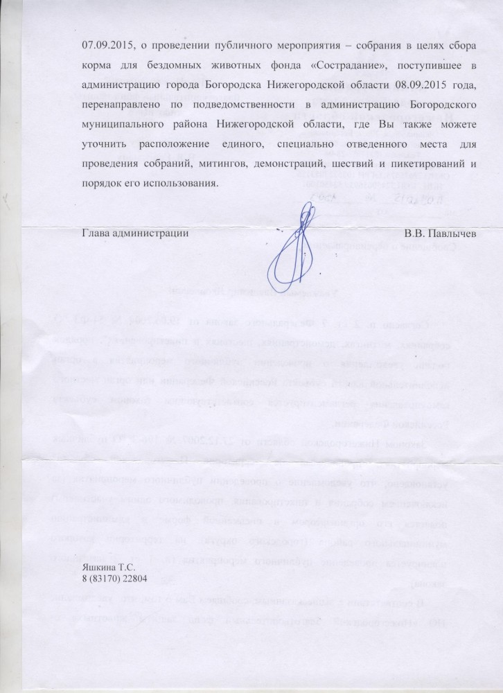 | Но и без ложки дёгтя не обойтись. Первоначально мы отнесли уведомления на массовое мероприятие в АДминистрацию города и Администрацию Богородского района. Нам дали (это ооочень важно) два ответа: - АДминистрация города в соответствии с законом 196-З "О массовых мероприятиях..." переадресовала нас в Администрацию Района, а там нам отвели место в Парке. Но мы все же сходили лично и объяснили, что акция не массовая - количество участников два человека. Просто точка сбора помощи для фонда, который работает официально и на законных основаниях. Мы не собираемся митинговать, что-то продавать, проводить собраний и прочее-прочее. Но мы все же попросили дать нам письменный ответ на нашу благотворительную акцию, чтобы в случае чего нас оттуда не выгнали неравнодушные люди. Ответ мы получили. Он выше в скане приведен. Согласовано.