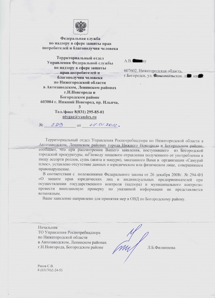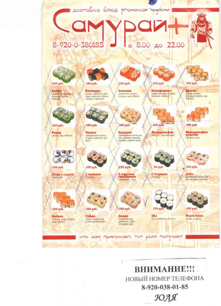 | Здравствуйте. После случившегося со мною недавно случая от друзей узнал, что на Богородском форуме имеется тема про суши и роллы и решил почитать, а после прочитанного ещё и зарегистрироваться и рассказать о своём знакомстве с сушами на дом. Сам я заказывал роллы в "Сакуре" и в "Самурае" и всё очень нравилось: в "Сакуре" всё знакомо и привычно, в "Самурае" дёшево. Под новый год попалась мне в руки новая реламка "Самурая", стекплером был прикреплен кусочек бумаги с указанием на новый номер телефона и имене "Юля". 06.01.2012 года сделал заказ. Привезли быстро. Оплатил, поел. Прошло время и почувствовал себя плохо. Стал звонить в "Самурай", нарвался на грубость. Рассмотрел рекламу, а под прикреплённым степлером клочком бумаги увидел нарисованный красным маркером плюс! Другая контора? Стал звонить по привычному номеру "Самурая". Оказалось номер у них не менялся и к деятельности "Самурая плюс" они никакого отношения не имеют! Вызвал скорую помошь, получил порцию лекарственных препаратов, промывание желудка и другие мерзости. 12.01.2012 года получил справку с диагнозом от отделения скорой помощи и 13.01.2012 года написал заявление в прокуратуру, те отправили моё письмо в Роспотребнадзор и что же в ответ "провести внеплановую проверку по Вашему заявлению не представляется возможным, так как отсутствуют сведения о юридическом или физическом лице совершившем нарушение! А это означает, что "Самурай плюс" на учёте в Роспотребнадзоре не состоит, о начале деятельности Роспотребнадзор не уведомлял, и жалобу я писал на несуществующую контору, которая и располагается-то неизвестно где! Вот так-то!