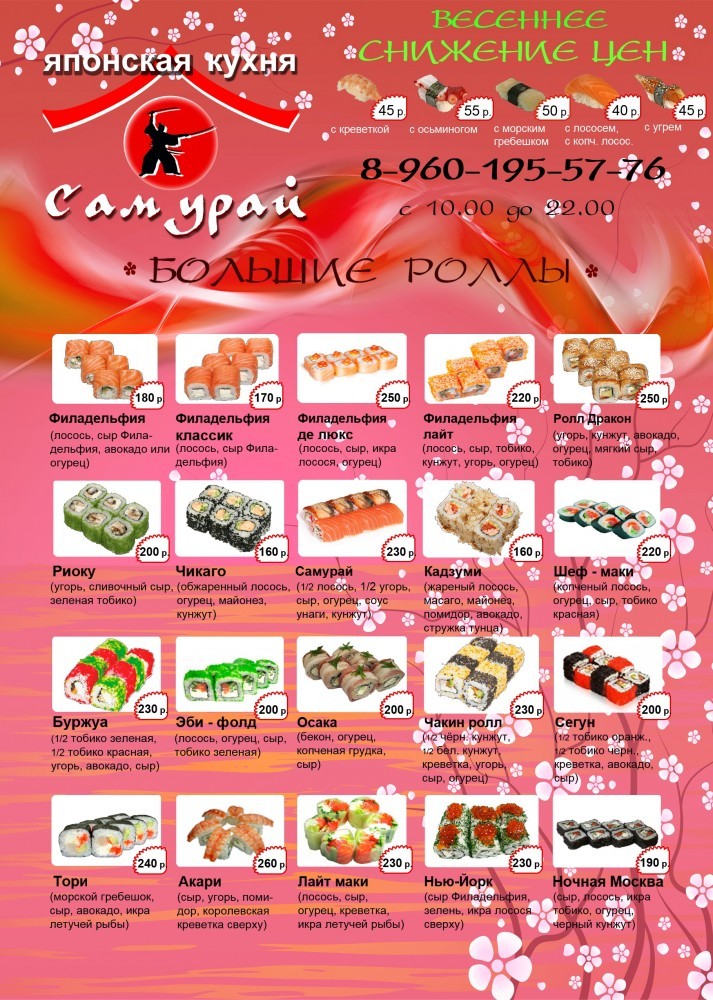 | У Самурая вышла новая реклама!!! Кстати очень хорошее снижение цен!!!! Не так давно заказывала на дом доставка не задержалась, даже приехала раньше!!!! Девочки все очень вкусно!!!! СПАСИБО