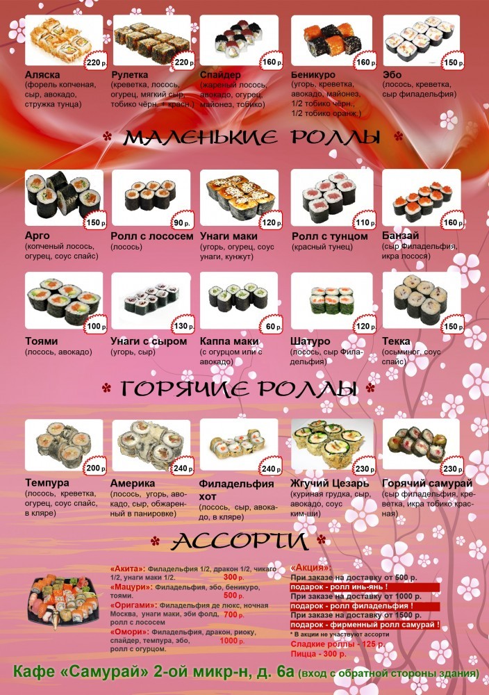 ivanlavr, рекламки расклеиваются по городу, так же Вы можете их взять в нашем кафе( 2 микрорайон д. 6 а), или мы можем Вам выслать при заказе. Настя25 снижение цен действительно произошло, ну например, филадельфия-180 р, филадельфия классик-170 р, дракон (угорь сверху)-250 р, эбо-150 р, с лососем-90р. В данный момент готовятся фотографии, чтобы создать здесь свою страницу, с меню, ценами и подарками. Надеюсь администрация форума нам поможет. Всем спасибо за поддержку!