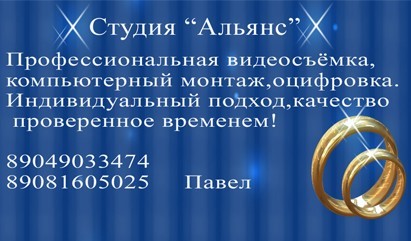 Студия"Альянс" Профессиональная видеосъёмка,компьютерный монтаж,оцифровка. Индивидуальный подход,качество проверенное временем! Стаж работы более 15 лет,видеосъемка по вашему сценарию, возможность фотосъёмки. 89049033474, 89081605025 Павел | |