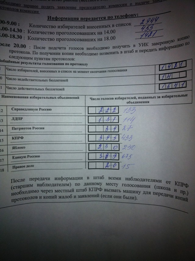 У меня вопрос, а почему такая разница по участкам, где были наблюдатели, сотрудничающие с Forbes и официалбными данными. 11:30. Итоги голосования на отдельных участках (по данным наблюдателей, сотрудничавших с Forbes): Николай Щенин: участок №2627, Москва: «Справедливая Россия» — 151 голос; ЛДПР — 119; «Патриоты России» — 12; КПРФ — 228; «Яблоко» — 143; «Единая Россия» — 226; «Правое дело» — 7. 16 бюллетеней признаны недействительными. Но вот по всему району данные уже сильно другие! См. здесь. Сергей Лаврущенко: участок №2265, Москва: «Справедливая Россия» — 233 голоса; ЛДПР — 142; «Патриоты России» — 34; КПРФ — 350; «Яблоко» — 195; «Единая Россия» — 282; «Правое дело» — 16. 20 бюллетеней признаны недействительными; участок №2266, Москва: «Справедливая Россия» — 207 голосов; ЛДПР — 177; «Патриоты России» — 20; КПРФ — 301; «Яблоко» — 165; «Единая Россия» — 244; «Правое дело» — 8. 19 бюллетеней признаны недействительными; участок №2267, Москва: «Справедливая Россия» — 196 голосов; ЛДПР — 152; «Патриоты России» — 16; КПРФ — 271; «Яблоко» — 172; «Единая Россия» — 257; «Правое дело» — 10. 13 бюллетеней признаны недействительными. Владислав Бородулин: участок №1561, г. Пушкин: «Справедливая Россия» — 26,9%; «Единая Россия» — 24,4%, КПРФ — 17,7%, «Яблоко» — 13,3%, ЛДПР — 10,8%. 10:15. Чуров озвучил последние результаты выборов по итогам подсчета 96% протоколов. ЕР набирает 49,54% голосов (на выборах в 2007 году — 64,3%), КПРФ — 19,16% (в 2007-м — 11,57%, ), «Справедливая Россия» — 13,22% (в 2007-м — 7,74%), ЛДПР — 11,66% (в 2007-м — 8,14%). | |