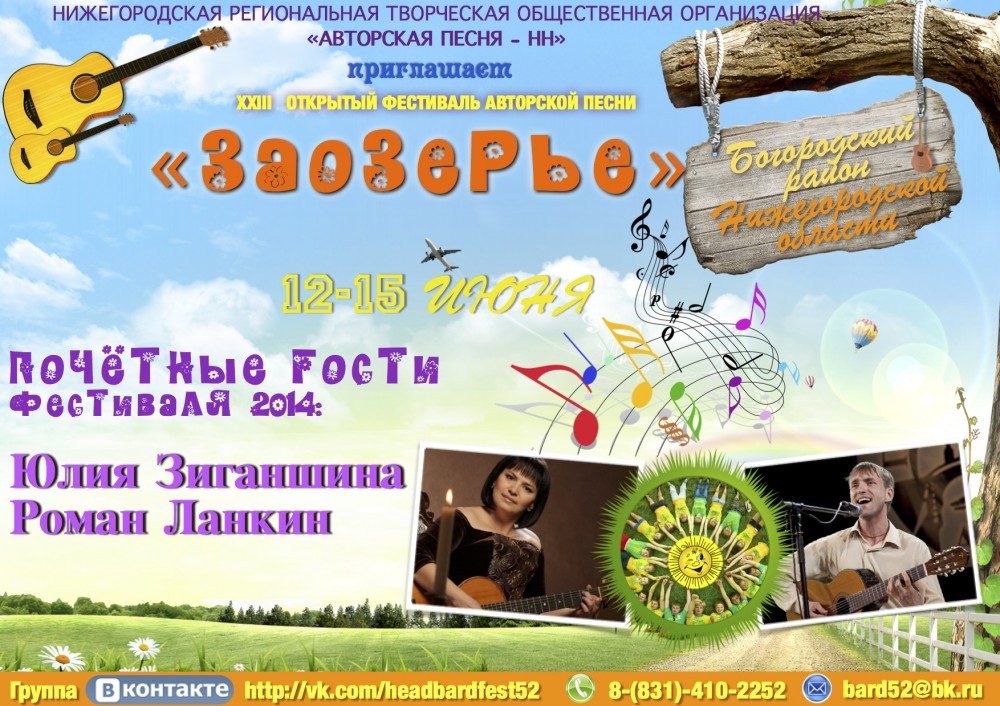 Дорогие наши друзья!!! С глубокой скорбью сообщаем вам, что в связи с объявлением режима чрезвычайной ситуации в лесах Нижегородской области, проводить фестиваль "Заозерье — 2014" запретили... Последние дни оргкомитет фестиваля предпринимал титанические усилия для вынесения положительного решения в пользу фестиваля, увы, тщетно. Нам очень грустно не только оттого, что отменено большое мероприятие, на которое затрачено колоссальное количество времени и сил, но и потому, что не удалось в очередной раз устроить для всех нас общий праздник души под названием "Заозерье"! ----------