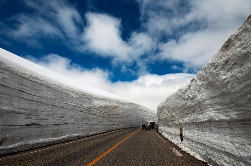 В горных районах страны снега зимой выпадает ну очень много: сугробами шестиметровой высоты тут никого не удивить. С огромными объемами снега коммунальные службы справляются с помощью тяжелой техники с бурами и снегометами, которые снег с проезжей части выбрасывают на обочину. Расчищать дороги тут принято по линии разметки и потому очень часто трассы превращаются в снежные тоннели со стенами невероятной высоты. Такую небывальщину очень любят туристы – снежные тоннели являются одним из самых популярных туристических объектов в Японии. А у нас снегопадик-это стихийное бедствие ----------