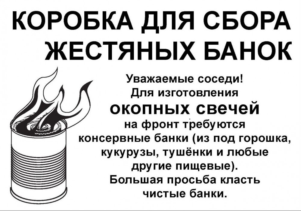Друзья! Соотечественники! Народ! Огромная просьба обратить ваше внимание на жестяную банку от кукурузы, горошка, грибов, маслин, которые вы будете вскрывать к праздничному столу. Очень прошу не бросайте эти банки в мусорное ведро! Из них можно сделать блиндажные (окопные) свечи. Основная функция блиндажной свечи это: освещение, локальный обогрев кистей рук (без касания корпуса), разогрев небольшого количества жидкости или пищи (в металлической посуде/таре). Ими пользуются наши бойцы на передовой. Сохраните каждую баночку. Напишите в личку. Приеду заберу в любом количестве, волонтеры сделают из них спасительные свечи. Всем неравнодушным ОГРОМНОЕ СПАСИБО!