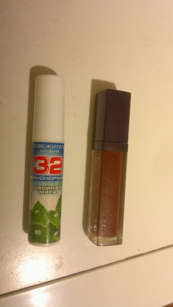 | а также по мелочи .. Зеркальце , помада жидкая( цвет темный шоколад , с мерцающими частичками) , освежитель дыхания(мята) ,крем для лица(сто рецептов..) ,маска для волос (больше половины) - За вкусняшку )
