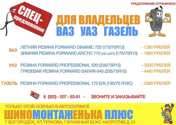 Сейчас самое время приехать к нам (скоро начнутся очереди), если у Вас: - лежит комплект дисков и резины для сбора; - лежат собранные колеса, которые нужно балансировать; - есть желание заказать у нас диски и/или резину и получить увесистую скидку на комплекс услуг шиномонтажа! ДО ЗАВЕРШЕНИЯ АКЦИИ ОСТАЛОСЬ 10 дней! | |