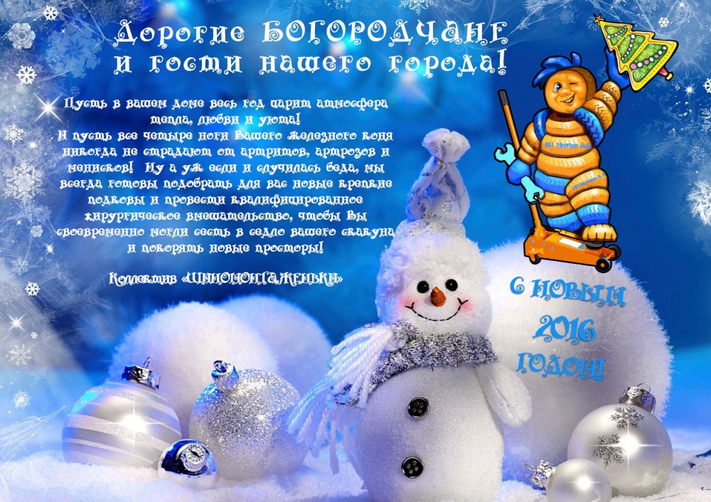 Коллектив «Шиномонтаженьки» поздравляет вас с НОВЫМ 2016 ГОДОМ! Мы бесконечно рады, что вы продолжаете выбирать НАС! И в знак нашей признательности, ВСЮ ЗИМУ мы БУДЕМ РАДОВАТЬ наших постоянных клиентов приятными СЮРПРИЗАМИ! А пока еще раз С НОВЫМ ГОДОМ!!! Пусть в вашем доме весь год царит атмосфера тепла, любви и уюта! И пусть все четыре ноги Вашего железного коня никогда не страдают от артритов, артрозов и менисков! Ну а уж если и случилась беда, мы всегда готовы подобрать для вас новые крепкие подковы и провести квалифицированное хирургическое вмешательство, чтобы Вы своевременно могли сесть в седло вашего скакуна и покорять новые просторы! P.S. ВЫХОДНЫЕ у ШИНОМОНТАЖЕНЬКИ только 1 и 2 января Но в случае ОСТРОЙ необходимости ремонта, позвоните по тел.:+7 987 557 29 88, и мы ПРИЛОЖИМ МАКСИМУМ УСИЛИЙ, чтобы вам помочь даже в праздники! | |