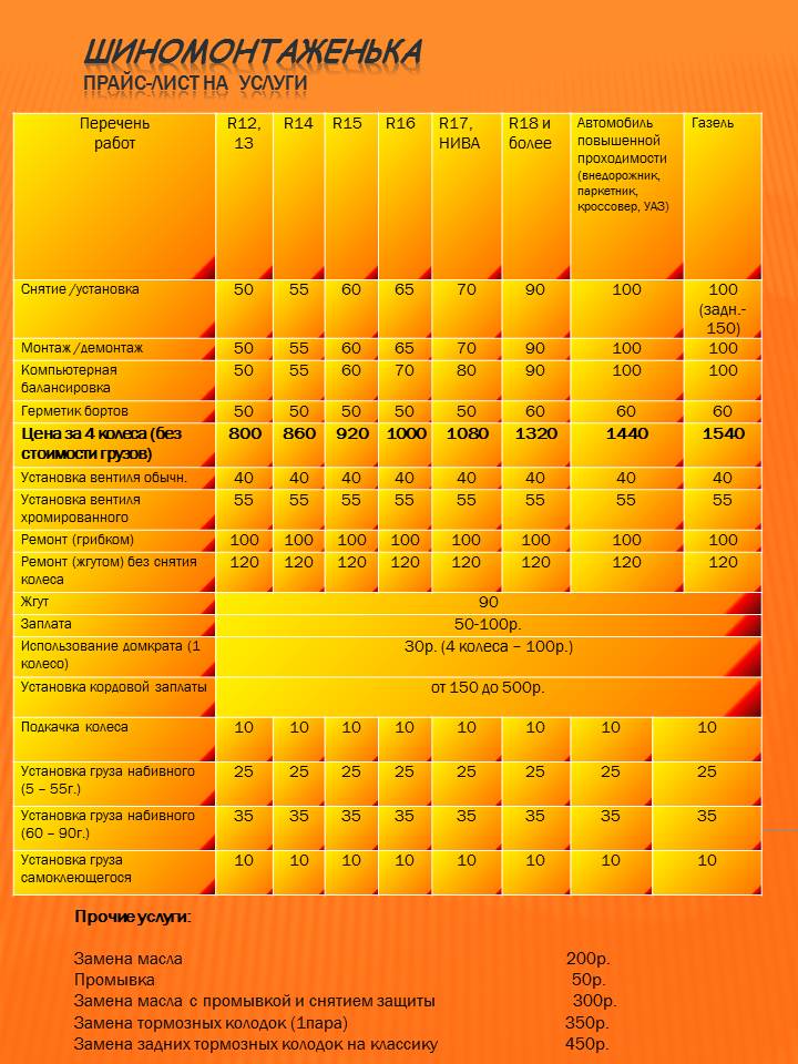 | shinomontazhnik написал: mamont543, около 1 т.р. тогда распиши, я люблю чёткость, что за что, напиши про одно колесо, снять с машины, снять с диска,одеть на диск, баланс, одеть на авто |