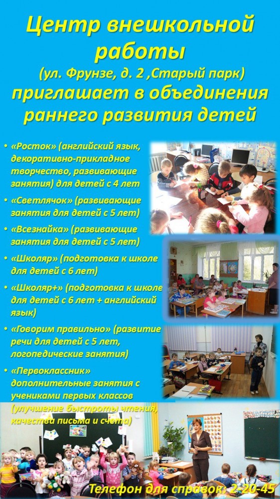 Объединение "Росток". Школа раннего эстетического развития - образовательное объединение детей дошкольного школьного возраста (с 4 лет). Занятия проводятся 2 раза в неделю и включают в себя цикл, состоящий из 3 учебных дисциплин: «Декоративно-прикладное творчество», «Развивающие занятия», «Английский язык». Объединение "Светлячок". Речевое развитие и формирование интеллектуальных способностей ребёнка через овладение элементарными математическими представлениями (образовательное объединение для детей дошкольного возраста с 5 лет, целью которого является готовность к школе) |