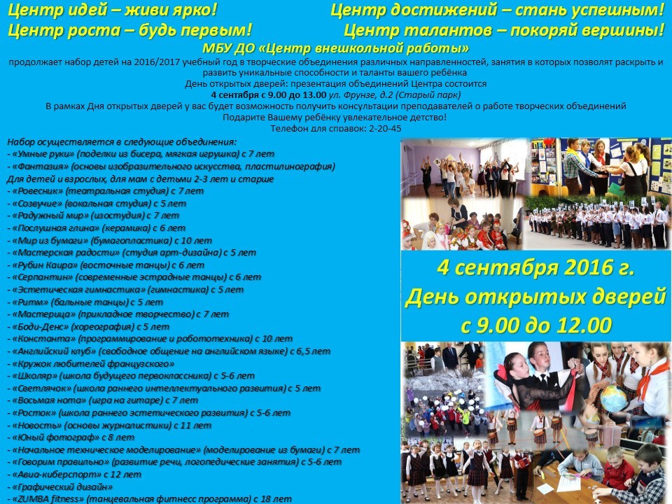 Светлячок: 1 год обучения - 4 сентября 9.00 2 год обучения - 29 августа 17.00 Всезнайка: 1 год обучения - 4 сентября в 10.00 2 год обучения - 30 августа в 18.00 Школяр: 4 сентября в 10.00 Английский клуб: 1 сентября 17.00 - 5 классы 18.00 - 2 классы 19.00 - 6 классы 2 сентября 17.00 - 3 классы 17.45 - 3 классы (2 год обучения) 18.30 - 4 классы 4 сентября 1 год обучения в 10.00 |