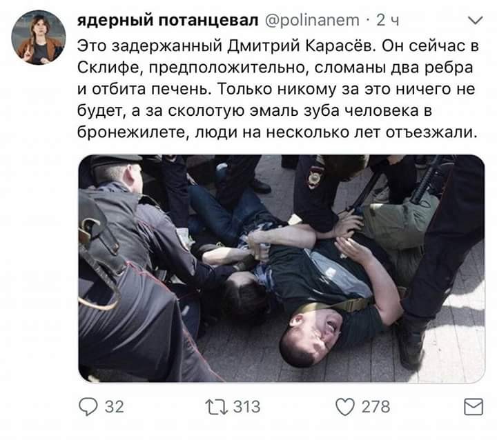 | Viktor IX Я просто смотрю на фотографии этих рож задержанных и не понимаю чему они так радуются или так неумело изображают насильственные действия со стороны органов правопорядка . Получив "правильный" удар ПР в область шеи или печени , они бы там лежали и загибались очень долго , а растаскивали их на носилках бы медики . Показушники , под руки их ведут , даже не крутят . Ага, прям ментовский беспредел , не иначе .