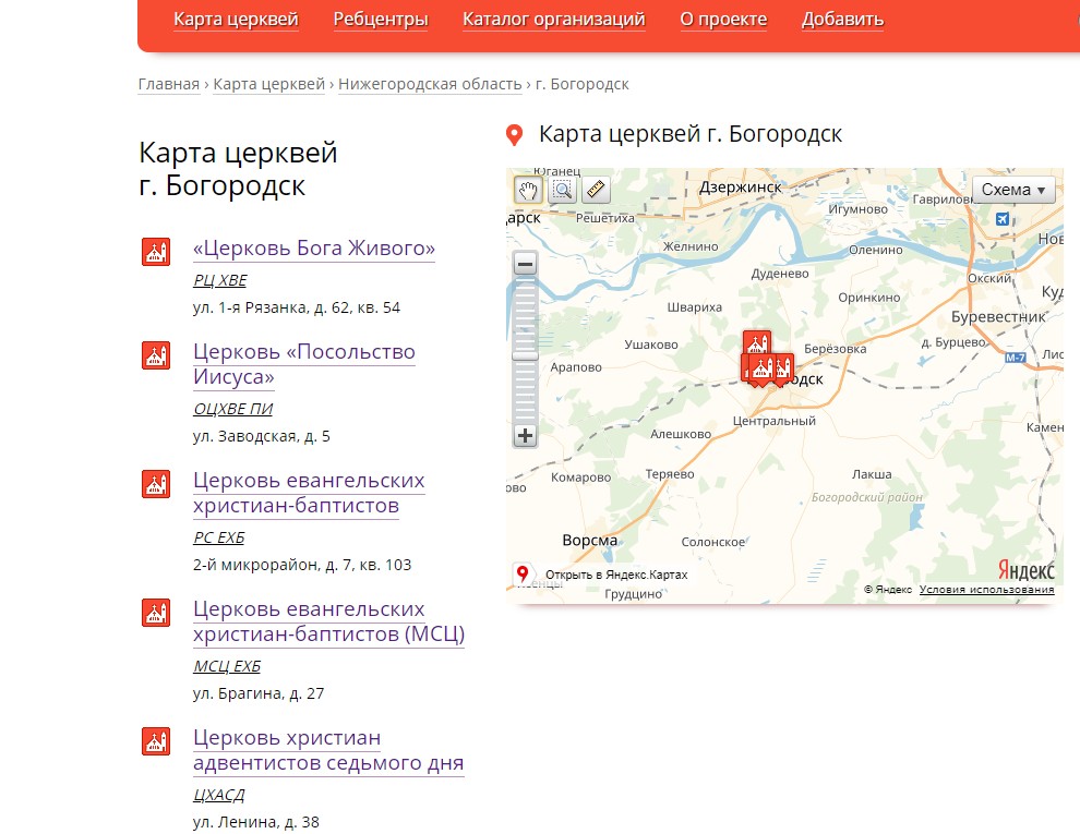 Последовал ответ,что официально зарегистрирован только православный приход. Оно и понятно,почему. ________________________________________________________________________ Между тем,открывая страничку с картой,допустим,протестантских церквей в Богородске,легко находим варианты "на своё вкус и цвет". Указаны телефоны,контакты,сайты. _______________________________________________________ Любопытно видеть на фото с сайтов этих "церквей" несколько знакомых лиц.Некоторые знакомцы не скрывают свои убеждения...Некоторые почему-то "стесняются" своей приверженности и никогда не говорили о своих "убеждениях". ______________________________________________ В любом случае,уже радует,что в Богородске есть выбор. -Ересь несёшь! | |