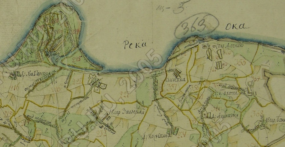 Отметил данное указание на карте "красным". От этого "старого" русла остались заливные луга и затока,откуда с пристани Дуденево отправлялись в своё время корабли | |