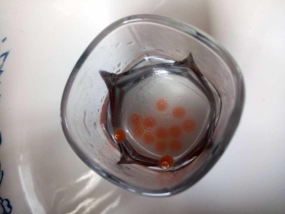 | У универмага стоят, торгуют икрой. Ради интереса взяли банку. Открыли, по вкусу ничего общего с настоящей. Хотели вернуть, но бабка с толку сбила, попробовала и аж две банки взяла. Домой пришли, вот что при опыте с горячей водой обнаружили(фото).