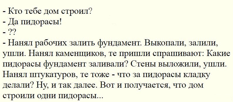 | Карабас написал: Марина, то, что ты описала быть не должно. Может подтянутся строители, подскажут. Правильнее бы, конечно на месте посмотреть и разобраться пока холода стоят.Неприятная ситуация конечно.Сразу анекдот вспомнился.... Любой "спец" даже одного профиля всегда обсер.т предшественника, менталитет такой. |
