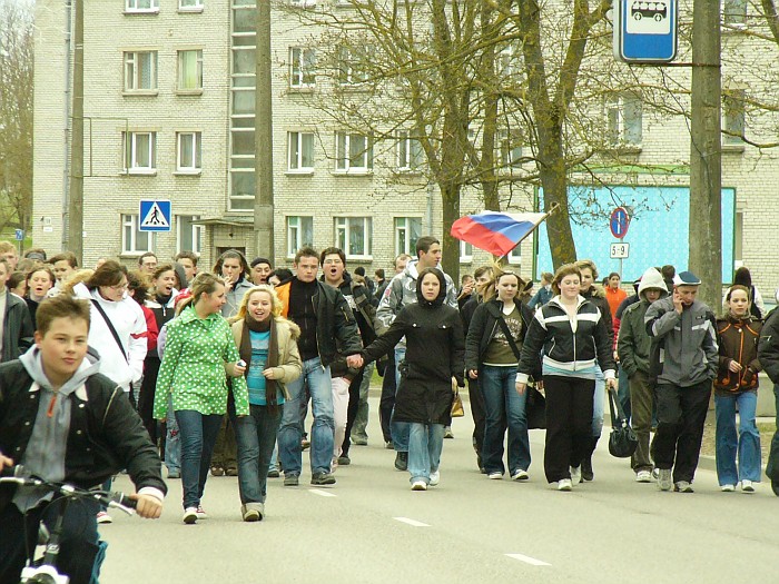 | Они ещё не знают, что их ждёт спецназ с железными дубинками и отряды кайтселийта, расстрел резиновыми пулями. Идут на митинг в маленьком городке в поддержку таллинцев.
