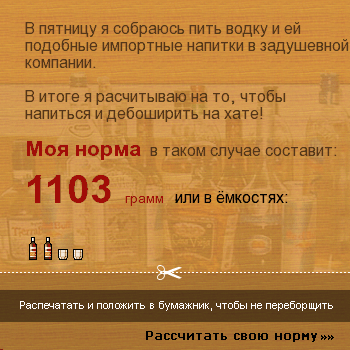 Yelle, забавно... в водке у меня что-то мало получилось..., но самое страшное что пива ещё меньше... наверное колькулятор поломал, пока децилитры пивные обсчитывал )))