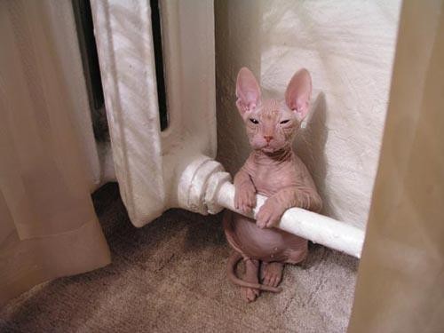 пытается забраться на батарею, но из-за строения тела-дирижаблем,не оч получается)))