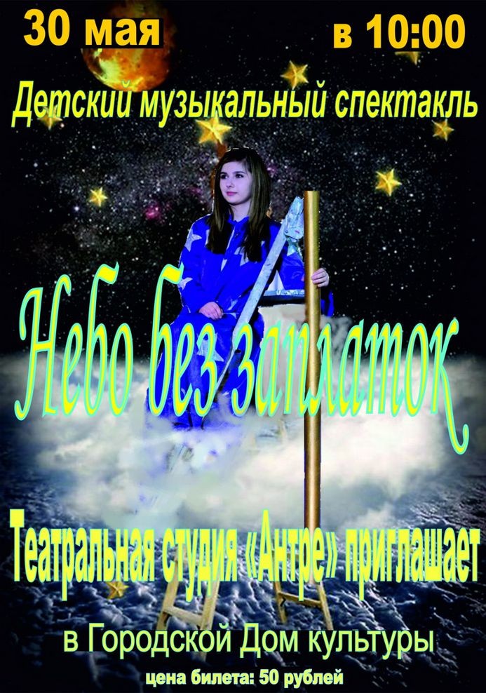 | 30 мая в 10:00 состоится показ спектакля "Небо без заплаток" для всех желающих. Цена билета: 50 руб. Справки по телефону: 2 - 03 - 41.