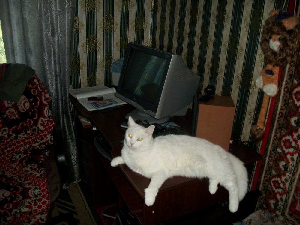 Часть 1. Звериная стать. С нами в трехкомнатной квартире на четвертом этаже пятиэтажного дома проживает ангорский кот, возраста приблизительно 4,5 года. Кот документов «на породу» не имеет. Окрас – полностью белый, но при ОЧЕНЬ внимательном рассмотрении на 1-3% местами имеет ПОДЖЁЛТЫЙ оттенок ошерстка. Ошерсток совершенно прямой, не вьющийся, а при напряжении животного редко, но регулярно ошерсток по диагонали спины /реже в другом ракурсе/ - вытягивается в визуально ощутимую /5-10 мм - горбиком/ ошерстную линию. Лапы – относительно массивные. Уши - относительно небольшие. Усы – длинные, разной величины. Шерсть – с середины апреля по июль СИЛЬНО теряется животным на окружающие предметы /паласы, стулья и т.д./, частично вылизывается им же и уходит через желудок. Ежедневно /особенно летом/ специальной расческой вычесываю кота, чем выбираю лишнюю шерсть из квартиры. Лично я вычесанную шерсть «для понта» собираю в отдельный целлофановый мешочек. Говорят, что когда будет много шерсти, можно будет связать из неё платочек… Но это не обязательно делать. Часть 2. Нрав и существо. К каждому новому человеку, прибывшему в квартиру, т.е. на территорию Кота, которого зовут Марчелло /для своих – просто Марчик/, он поначалу относится ТОЛЬКО положительно: доверительно обнюхивает верхнюю одежду в прихожей, трется о ноги в комнате, зачастую «мурлыкает». Но! Если прибывший начинает кота «доставать», - дразнить, хватать «как попадя», делать резкие движения, кричать /и так – несколько раз/ Марч запоминает и в следующих случаях на контакт с таким человеком не идет, а зачастую уже при приближении встречает просто шипением, с готовностью спрятаться или всерьез ударить обидчика лапой, укусить. Мой кот – ЗЛОПАМЯТНЫЙ. И правильно: в нашем Доме все равноправны и обижать ни человека, ни кота никому не дозволено. Как и каждый из нас, Марчик изо дня в день живет ПО СВОЕМУ личному распорядку суток, но таким образом, что НАШЕМУ распорядку это не мешает, а мы тоже УЧИТЫВАЕМ возможные действия Кота в течение суток. Например, Марчелло хорошо знает, что «чесать» когти можно ТОЛЬКО о старый диван и стул, а мы знаем, что Кот не любит, когда при нем чихают или ОЧЕНЬ громко разговаривают. Иногда бывает, что, скажем, я хочу с ним поиграться, а Марчик – не настроен. Тогда – принимается линия Кота: игра откладывается. В обратном случае /кот хочет играться, я – не хочу/ - игра таки, как правило, проводится, через моё «не хочу», ибо в данном случае срабатывает НАШЕ неписанное правило: в своем желании ПРАВ более СЛАБЫЙ член нашего коллектива… Такая доверительность, при в общем-то СКВЕРНОМ характере Марчика, позволяет РУКОВОДИТЬ Котом в повседневной жизни, который /кот/ где-то на уровне подсознания /инстинкта/ понимает, что при определённом «равноправии» главенство остается за человеком. Часть 3. Стиль его жизни. 1/. Утренний моцион. Около 06.00 Марчик будит меня вне зависимости времени года. Это происходит ЕЖЕДНЕВНО с июня 2010 года, когда я начал днём на поводке выводить его на улицу, а он /Марчик/ через неделю выгулов ЛИЧНО принял решение справлять естественные надобности ТОЛЬКО во дворе дома, хотя в квартире есть место для этого и Кот об этом знает. С того времени он «справлял» дома по необходимости /болезни/ свои надобности не боле ПЯТИ раз, что не отменяло утреннего моциона в тот же день. А так, - выход