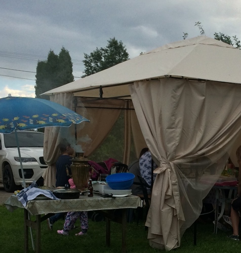 А вот эта палатка вообще улетела вместе с каркасом, стоила три сотни, нашли только несколько железяк, а купол, наверное, в стратосферу удуло. После этого сделал стационарную беседку из брёвен и досок. ----------