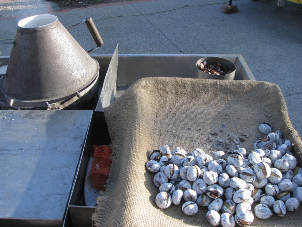 Но вот те, жаренные, которые продают негры на площади Конкорд, примерно одинаково приготавливают по всему средиземноморью. 11 ноября, практически вся католическая Европа празднует день Святого Мартина. Именно в этот день, начинают есть жаренные каштаны нового урожая(типа нашего яблочного спаса). В этот день по всем средиземноморским странам, жарят на гриле свиную грудинку, закусывают её жаренными каштанами и пробуют молодое вино, которое было сделано в конце сентября и выстоялось свои положенные 40 дней. | |