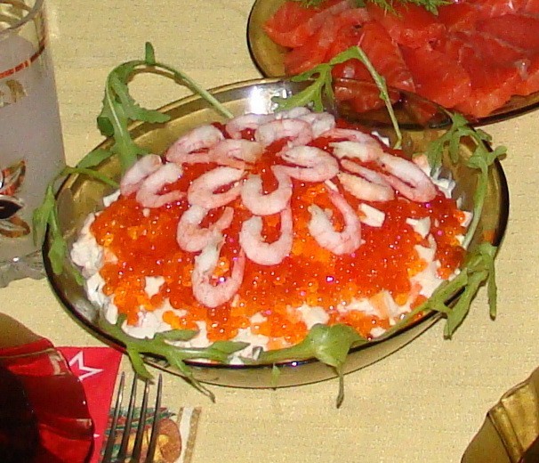 | efrem написал: Где рецепты??? Нептун: - креветки мелкие - кальмары - яйцо куриное вареное - крабовая колбаса - мясо криля - красная икра - майонез (прямо перед подачей на стол) Ананас: (слои) - картофель - ананас - грецкий орех - яйцо - мясо (курица, говядина, крольчатина - кто что любит) - ананас - картофель -яйцо всё сверху украшаем половинками грецкого ореха. Приятного аппетита! ----------