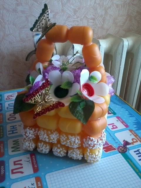 | Корзина из киндер-яиц, цветы бутылочки-"агуша", серединки цветов из пробок-раст.масла.