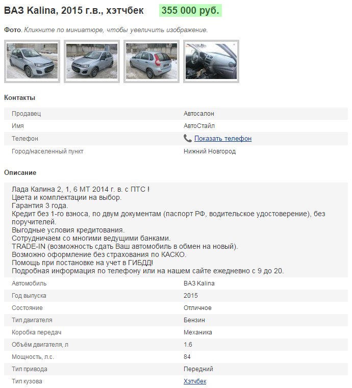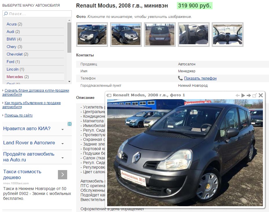 Цитата: elusive, да стандартная страничка. Только путаница с годами, а так для перекупов нормально это Вы про различия года выпуска в тексте и в заголовке? так эти поля и вообще все поля заполняет продавец, как он заполнит так и будет в форме подачи объявления у меня есть отдельные поля, где указывают год, марку, модель и т.п. а потом идёт поле *текст объявления*, вот в тексте можно написать почти всё что хочешь )), кроме ссылок на сайты | |