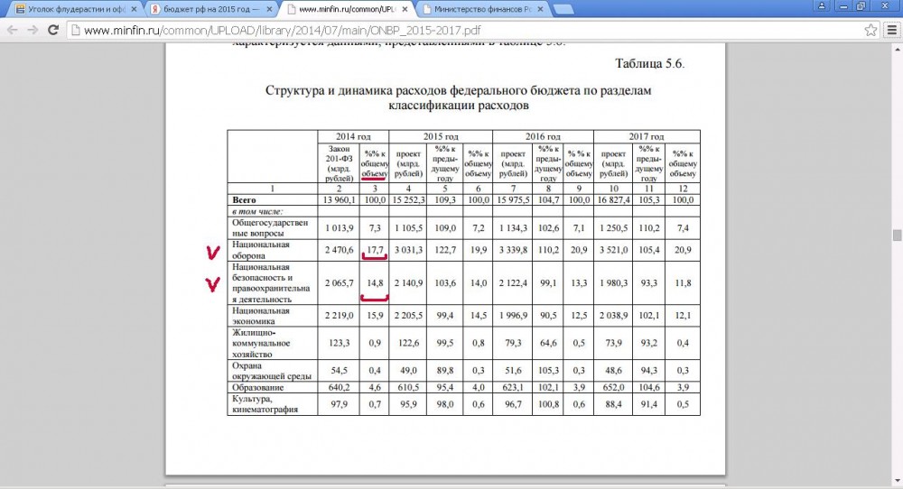 Он ведь несчастный и не знает уже, наверное, что думать про расходы на оборону и полицию. А ответ ищется за полминуты. Документ с сайта Минфина "Основные направления бюджетной политики на 2015 год и на плановый период 2016 и 2017 годов", стр. 73, раздел 5.3. "Структура и динамика расходов федерального бюджета по разделам классификации расходов бюджетов" http://www.minfin.ru/common/UP...5-2017.pdf |