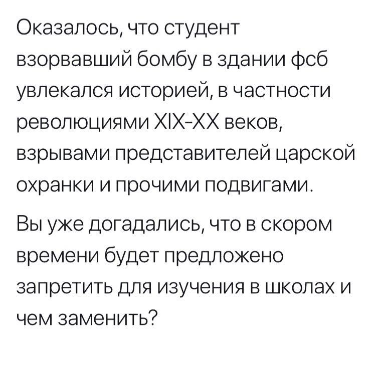Впрочем, и за границами России полно таких же. Тот же тупарь Буш-младший у американцев изобрёл сам термин "международный терроризм", в его современном понимании, к радости всех правителей на свете, вместо того, чтобы посмотреть в зеркало. А ведь были звоночки задолго до 9/11 - Маквей взорвал целый административный центр в Оклахома-сити в 1995-м, после чего объяснил свои действия предельно откровенно и подробно. Но кто его слушал? Что касается нас, то пуинский зомбоящик каждый день, с утра до вечера, пышет злобой и сеет ненависть ко всем, кто идёт не в ногу с Россией. Вот пусть и пеняют на себя, когда керченский ватан устроил бойню. Он очень Путина любил. А всех остальных - не очень. ----------