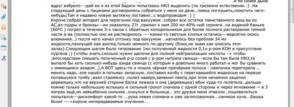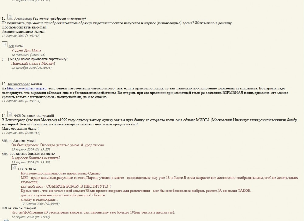 Про бомбу в институте. У нормальных людей поползновения смастерить что-то взрывающееся проходят годам к 12-ти, если и были. Ну максимум к 14-ти, но это край, почти неприличный. А когда дебил учится в институте (как он туда попал?) и в общаге занят не водкой и девками, а вещами, стоящими в одном ряду с детской мастурбацией, тут и сказать даже нечего. Это клиника. Странно, что ты выбрал для копипасты именно это. ----------