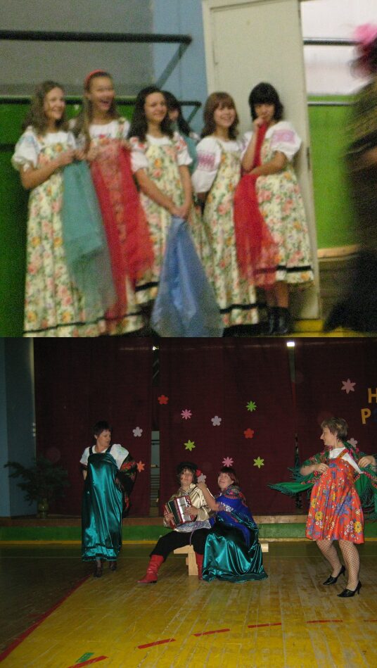 Сначала нас было только четверо. А потом вдруг набралось чуть не сотня. Повезло , что сразу нашли умелых ведущих. Не знаю почему, может оттого, что пик заказов прошёл, или просто кореш был на взводе, но они сами загорелись и согласились поработать за символическую плату в сотню за час. Нашей задачей было подобрать помещение и соблазнить побольше народу и каждого привести к ведущим, плюс договориться с самодеятельными коллективами. Все участники получили задания на номера. Чтоб не заморачиваться со спиртным и едой, участники брали всё своё с собой, объединившись в компании заранее. В клубе вдоль стен расставили столы, середина и сцена оставались чистыми, лишь ёлка в центре. Классическую схему: концерт, застолье, танцы слегка изменили, начав с застолья. Причём, за каждым столом(столы условные, стояли все в ряд) должен был произноситься тост, причём, не какой-то, человек должен был натурально похвастаться своими хорошими делами, а ему помогали знакомые вспомнить. За это и поднимались бокалы всем залом. Чтобы народ не отяжелел от еды и не упился, ведущие занимали всех конкурсами и танцами. Оформление сцены менялось несколько раз из запасов клуба. Выступления коллективов и самих участников вставлялись в ход праздника. Ну, здорово вышло! Когда-нибудь соберу все видеозаписи и склею ролик. Вот ещё несколько фоток. |