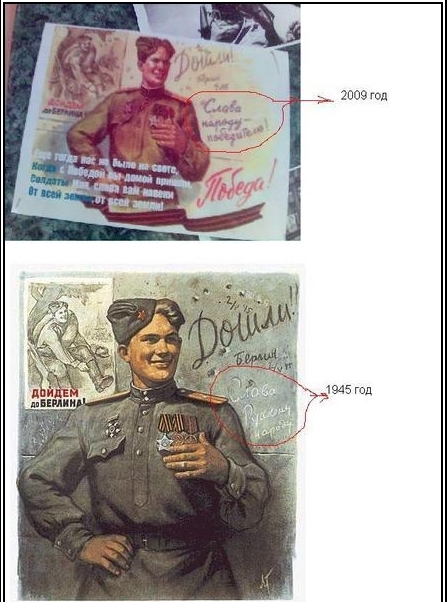 | Те, кто вырос до 90-х годов, наверняка помнят два агитплаката времён ВОв, один из которых назывался "Дойдём до Берлина" с Васей Тёркиным, переметывающим портянки на фоне наступающей колонны, и плакат "Дошли!" с Васей в Берлине и фоновым рисунком-напоминанием предидушего плаката(картинка ниже).
