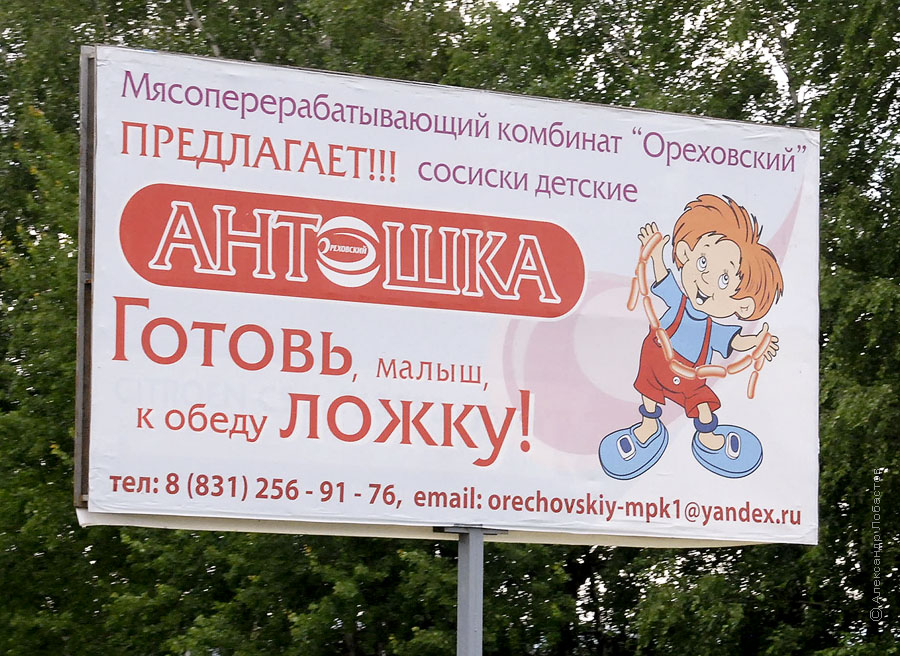 Каждый день на подъезде к Новинкам (если в сторону НН ехать) видел билборд "Антошка". Ну билборд и билброд. Думал, рекламируют какой-то детский магазин. Внимания практически не обращал на него по причине его полной визуальной неинформативности. А тут встали в ремонтной пробке точно возле него. Детский магазин? Хрен там ночевал! Вот что написано на билброде: Мясоперерабатывающий комбинат "Название" предлагает сосиски детские АНТОШКА. И рекламный слоган там еще: ГОТОВЬ, малыш скорее ЛОЖКУ. Просто шедевр! Мясоперерабатывающий комбинат. АНТОШКА. Сосиски детские. АНТОШКА! Ганнибал Лектер отдыхает. В этой наружке все прекрасно! даже Антошка рыжий в качестве иллюстрации приложен. Реклама сосисок проиллюстрирована не сосисками, а ребенком. Ну а вопрос "кто из вас ест сосиски ложками" уже как-то задавать страшно. Дружочки, софтографируйте, если возможность будет. Не должно пропасть. ----------