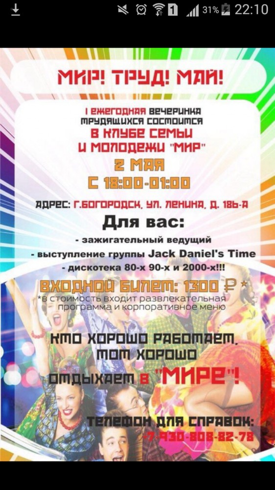 | Что касается "Апельсина", это на первомайские, пожалуй, либо боулинг, либо... что ещё нам сможет предложить Даша. На девятомайские полюбому шашлыки-природа, подробности как раз на первомайские и обсудим.