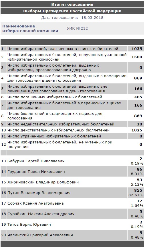 Меня реально больше всего смущает ситуация по третьей школе. Если по всем остальным УИК ситуация вполне обыденная и вопросов не вызывает, то по УИК 212, где проголосовали все до одного избиратели, включенные в списки, заставляет засомневаться в адекватности цифр. Где-то косяк.