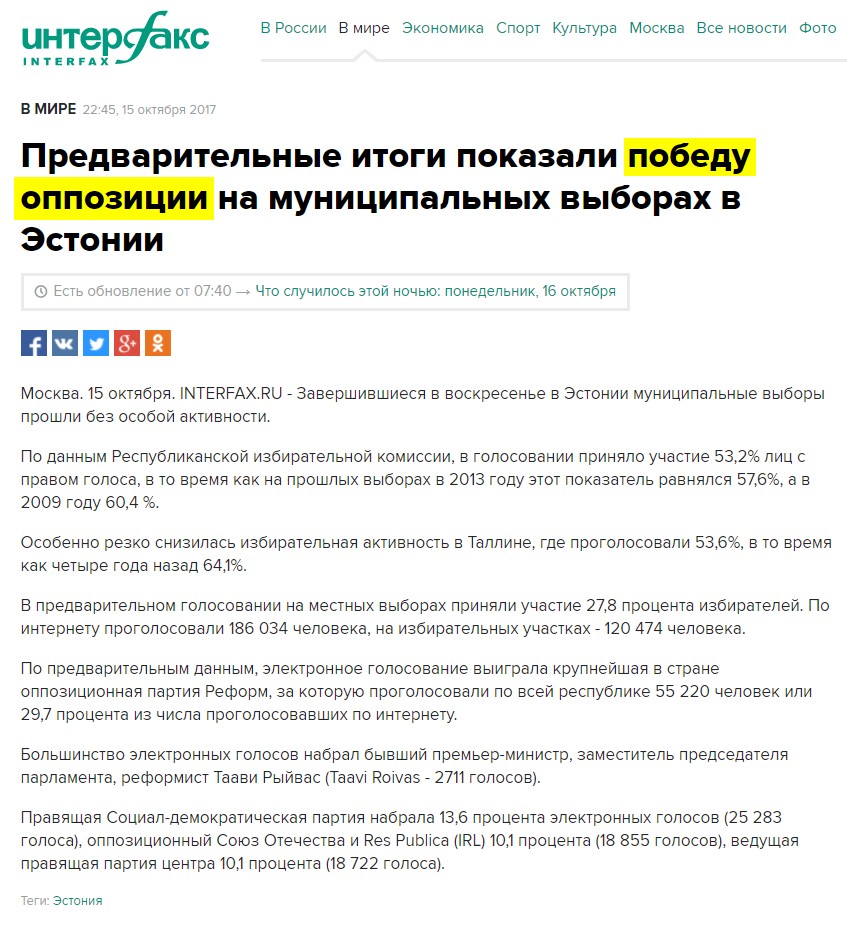 Ranger написал: Сегодня в Эстонии прошли ,,местные,, выборы. Никаких ,,навальных,, и разной котосволочи не прошло Идем в гугол и открываем первую попавшуюся ссылку. И внезапно что мы видим? А видим мы, что кто-то пустозвон. И еще особенно мило читать сообщения о том, что нам враги на западе навязывают своих кандидатов от чувака, который живет заграницей и навязывает своего кандидата. ----------