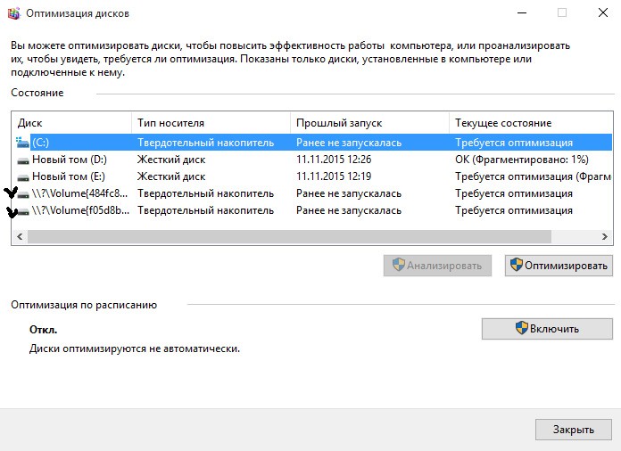 Что за неизвестные диски в программе оптимизации дисков, может кто знает? На компе они ни где не отображаются, единственное жесткий диск периодически завывает. Может воет из-за этого? Проверка на наличие ошибок ни чего не дала. Конечно это не беспокоит, но любопытно.